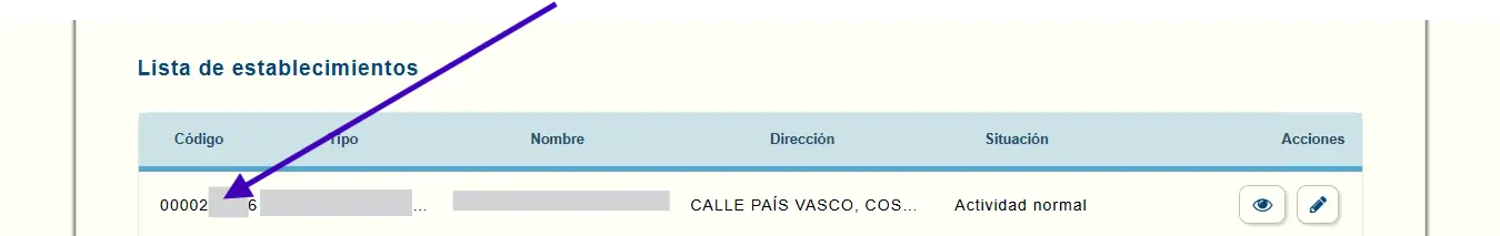 Dentro de “Lista de establecimientos” verás cada alojamiento o establecimiento registrado. El número que aparece al principio de cada fila corresponde al código de establecimiento. Copia el código del alojamiento correcto y úsalo en Eurocheckin.